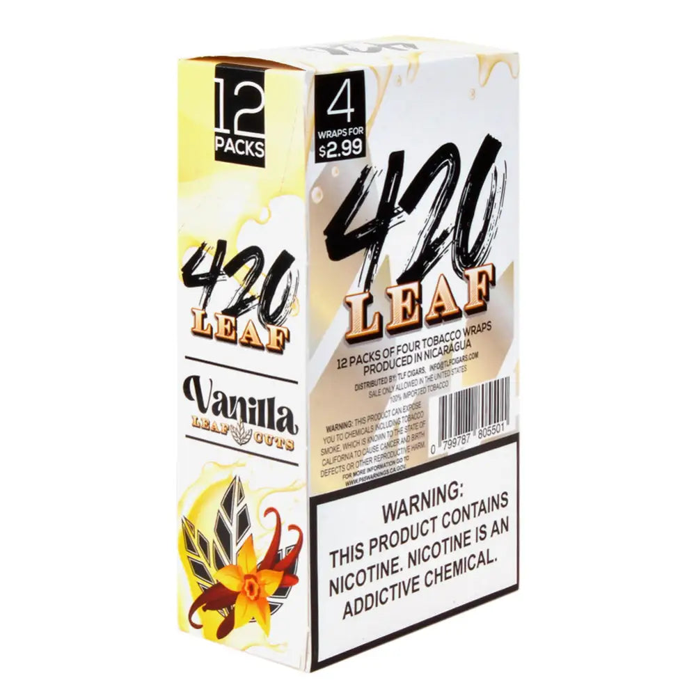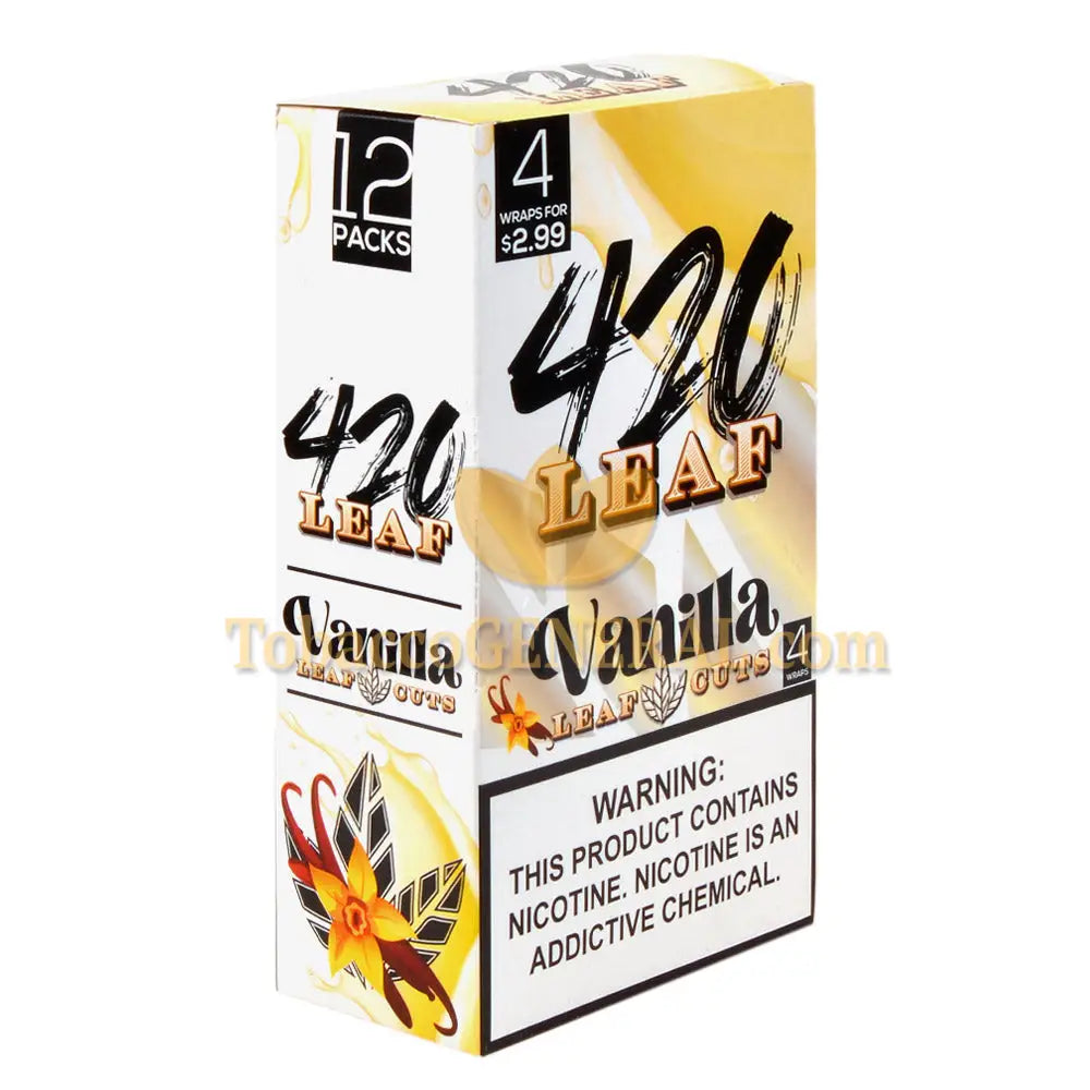 420 Leaf Vanilla wraps are pre-priced at $2.99. Each box contains 12 pouches of 4 wraps per pouch.